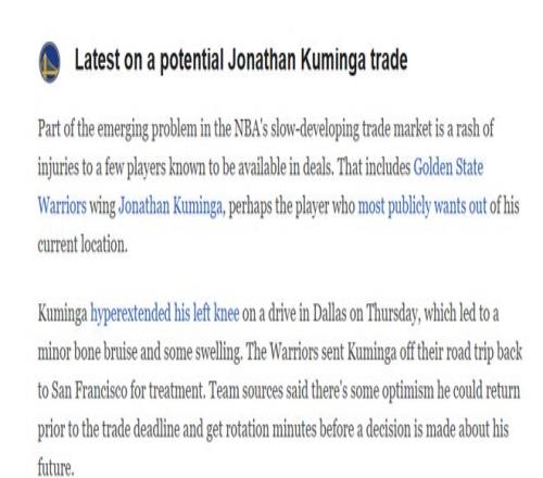 又是一名与勇士队有关的球员,并且他的处境与巴特勒息息相关,在巴特勒受伤之前,库明加与勇士已经做好分手准备,结果巴特勒意外受伤,导致目前库明加前途不明。