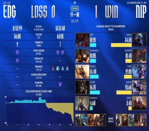 第一局HOYA选出上单韦鲁斯。前期Xiaohao皇子2级抓下逮捕Assum一血,上河道团战,HOYA韦鲁斯与Guwon蔚各自为战被EDG三人逮捕。巢虫团Guwon蔚击杀Parukia,NIP拿到两条小龙。