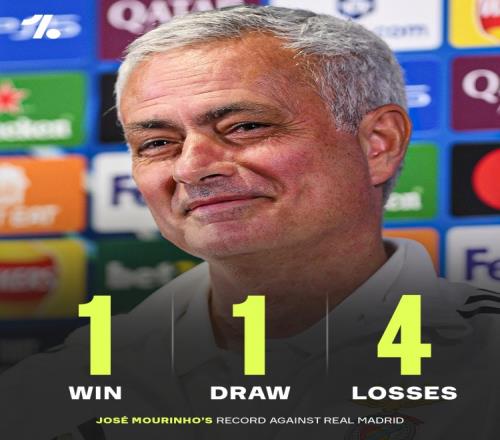 据媒体统计,穆里尼奥执教生涯首次击败皇马,带队对阵皇马战绩1胜1平4负。