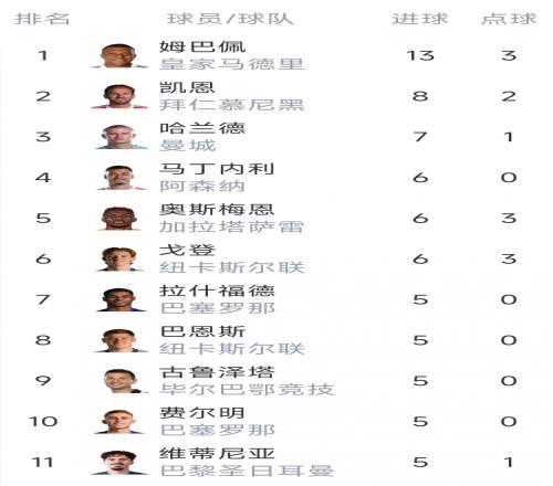 本赛季欧冠联赛阶段射手榜:姆巴佩13球居首,凯恩8球,哈兰德7球