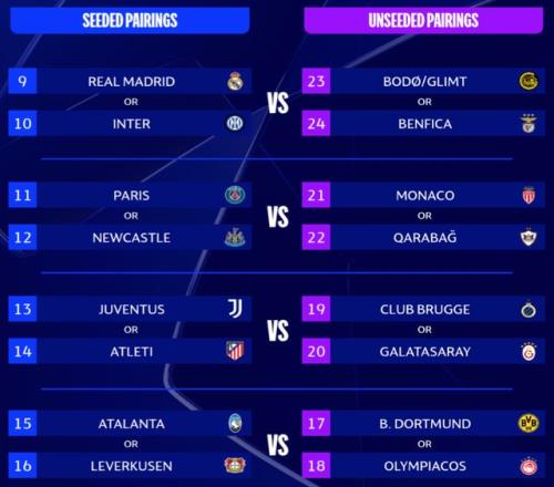 排名9-16的球队,将作为种子队:皇马、国米、巴黎圣日耳曼、纽卡、尤文、马竞、亚特兰大、勒沃库森。