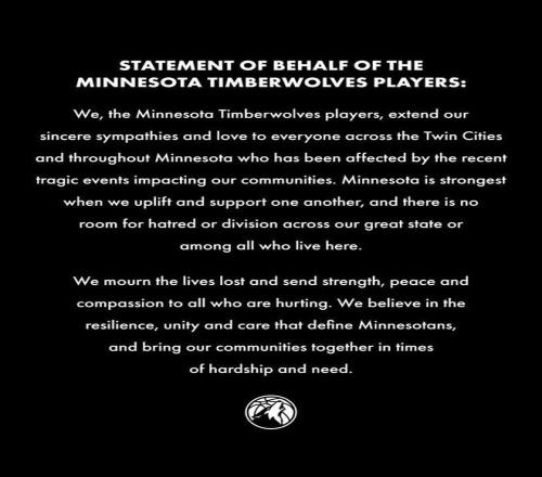 我们,明尼苏达森林狼的球员们,向双子城(明尼阿波利斯和圣保罗)及整个明尼苏达州所有受到近期社区悲剧事件影响的人们,致以诚挚的慰问与深切的关怀。明尼苏达州最强大的时刻,在于我们彼此扶持与激励;在我们伟大的州境内,在所有居住于此的人们心中,都不应给仇恨或分裂留下容身之所。