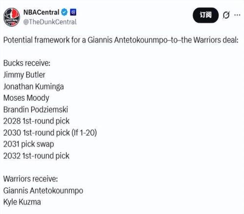 勇士已联系雄鹿,愿意送出除库里外所有资产。无论字母哥伤势如何以及回归时间表是否明确,这一意向都不会改变。雄鹿队记Nehm列出了双方8换2交易的潜在框架。勇士送出巴特勒、库明加、穆迪、波杰姆斯基、2028年首轮选秀权、2030年首轮选秀权(如果顺位在1-20)、2032年首轮选秀权、2031年选秀权互换资格,从雄鹿换来字母哥和库兹马。