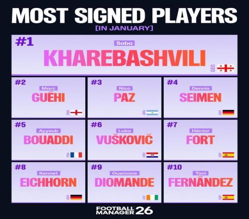 马克-格伊、尼科-帕斯、迪奥曼德、阿尤布-布阿迪……看到这些名字还算正常。然而,在热门游戏《足球经理》1月份全球最常被签下的十名球员中,有一个排名第一的名字格外引人注目,因为几乎无人知晓他是谁——:萨巴-哈列巴什维利(第比利斯,2008年9月3日出生)。