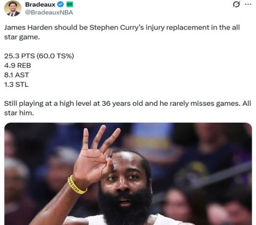 火箭媒体人Bradeaux也呼吁联盟挑选哈登入选,并且给出两大原因,第一点是36岁的哈登依旧保持着顶级比赛影响力,场均拿下25.3分4.9板8.1助1.3抢断,真实命中率60%,第二点是哈登几乎不缺席比赛,理应入选全明星。