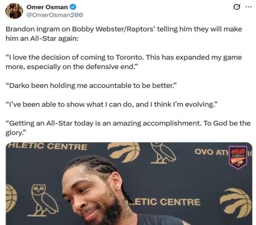 对此英格拉姆本人自然也十分开心,接受采访时笑着说道:“我对加盟多伦多的决定感到满意,这极大得提升了我的比赛水平,尤其是在防守端,拉贾科维奇一直在督促我变得更好,我在这里有足够的空间展示能力,并且认为自己正在不断进步,能够入选全明星阵容是一项了不起的成就,一切荣耀归于上帝。”