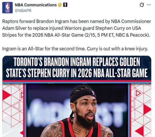 最终NBA官方宣布,总裁萧华指定英格拉姆入选全明星,替代因膝伤缺席全明星的库里,代表美国队参赛。