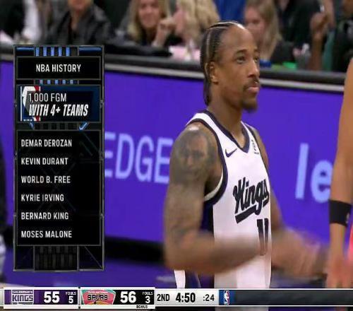德罗赞在4支球队达成命中1000记运动战进球里程碑,成为NBA历史第6人,前5人分别是杜兰特、弗里、欧文、伯纳德-金与摩西-马龙。
