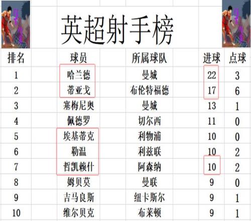 射手榜方面,哈兰德22球领跑,蒂亚戈17球排在第2,塞梅尼奥13球位列第3。佩德罗11球排在第4,哲凯赖什今天梅开二度后,追上埃基蒂克和勒温,三人10球并列第5,前十的门槛也被提高到了9球。