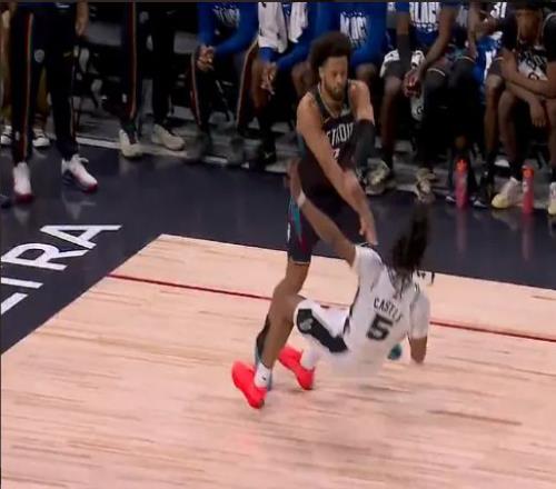 次节比赛双方爆发冲突,先是坎宁安推倒卡斯尔,随后凯尔登上前推搡坎宁安,杜伦冲过去手指凯尔登,裁判吹罚凯尔登与杜伦各一次技术犯规。