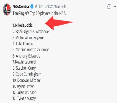 在这场比赛之前,美媒The Ringer选出了本赛季前50球星,约基奇第一、亚历山大第二、文班亚马第三、东契奇第四、扬尼斯第五、华子第六、伦纳德第七、库里第八、坎宁安第九、米切尔第十。