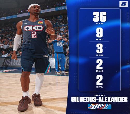 全场比赛33分46秒,亚历山大29中12,三分3中0,罚球13中12,拿到36分9助攻3篮板2抢断2盖帽,命中率41.4%,真实命中率51.8%,正负值+16。亚历山大完完全全的躺赢一场,第四节不是卡鲁索两个三分早已输球,加时赛关键1断1上篮帮助球队拿下胜利。