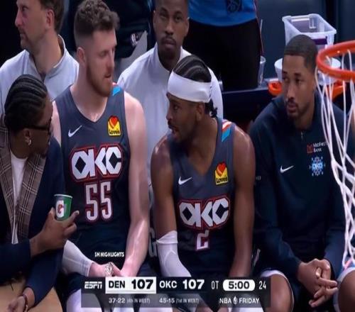 这场比赛亚历山大在常规时间四节打完后就被DNP了,第四节还剩2分01秒卡鲁索三分命中,末节还剩1分23秒卡鲁索三分再度命中,没有这两个三分雷霆已经跪了。约基奇篮下完成勾手后,终场前26秒亚历山大撤步三分被布劳恩大帽,随后卡约三分反绝杀也未能命中。
