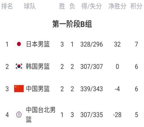 日本队以3胜1负战绩来到小组第一,韩国队第二个窗口期连负台北、日本,排名下滑到第二,中国队一波2连胜后,和韩国队同积6分暂居第三,台北1胜3负位列第四。