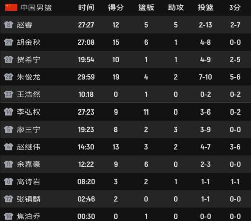 看看数据统计,中国男篮5人得分上双,表现最好的球员肯定是朱俊龙,他10投7中,进了5记三分,砍下全队最高的19分,外加4板2助,追分时刻就靠他,太拼了,祝贺中国队2连胜!