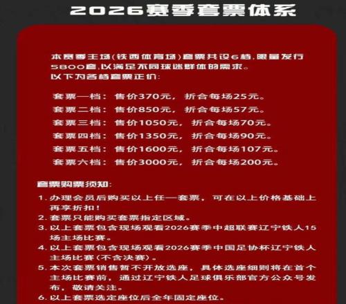 中超今年好看了,一些球队的年票竟然比业余比赛还要便宜,绝对超值啊。2026赛季中超各队套票价格已经全部出炉了,散客年票价格最低的是辽宁铁人,370元看全年,平均一场票价25元,球队坐拥全中超最贵的5外援阵容,这个票价确实非常超值。