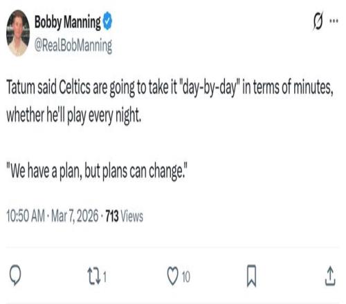 除此之外,塔图姆还公开谈及自己回归后的长期计划,他坦言球队有明确的计划,但计划也会随时改变,会按照一天一天不同的状态来决定出场时间,以及是否每晚都出战。