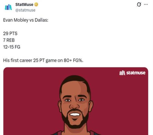 莫布利更是打出生涯标志性一战,在仅出战23分钟的情况下,15中12,拿到29分7板2助1抢断,这是其生涯首次以80+%命中率砍下25+分。