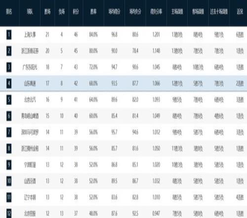 拥有张镇麟和怀特塞德等新援的上海队已冲到榜首位置以21胜4负傲视群雄,今年大有登顶的势头,卫冕冠军广厦队20胜5负紧随其后,广东队18胜7负第三,山东队17胜8负第四。