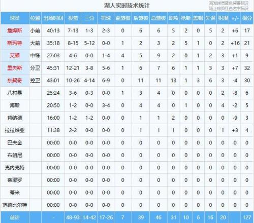 里夫斯32分7板6助、东契奇30分11板13助3帽、斯玛特21分3板2助5断、詹姆斯17分6板5助2断、艾顿9分9板2助、八村塁6分4板、海斯5分4板、拉拉维亚4分1板1助