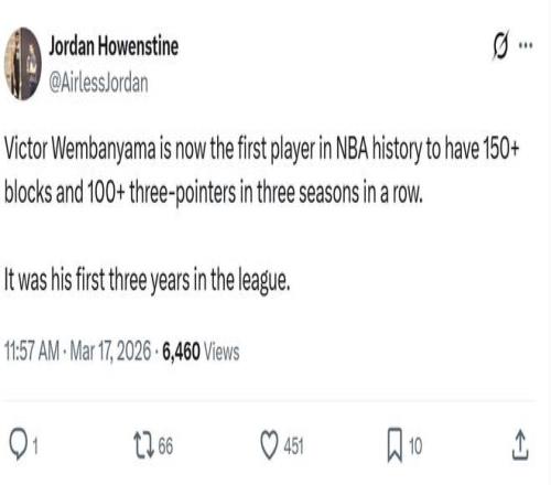 值得一提的是,文班亚马还创下了NBA历史第1神迹。数据表明:文班亚马连续三个赛季至少150盖帽100三分,NBA历史首人。