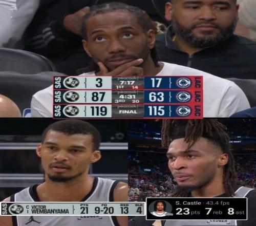 马刺第一节上来差点被打懵,不到5分钟被快船打了一波17-3,第一节打完,马刺还以29-37落后8分;