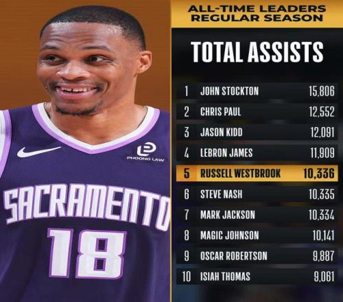 威少生涯常规赛总助攻数,连续超越马克-杰克逊与纳什两位退役名宿,升至NBA历史助攻榜第5位。