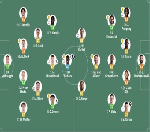 布莱顿(4231):1-维尔布鲁根;27-魏费尔,6-范赫克,5-邓克,24-卡迪奥卢;20-米尔纳(76’17-巴莱巴),30-格罗斯;25-戈麦斯,13-辛谢尔伍德(83’26-阿亚里),11-明特(76’22-三笘薫);18-维尔贝克(83’10-鲁特尔)