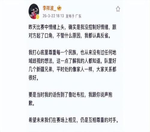 当然,任何地域性的攻击都不值得被提倡,但要对李祥波上纲上线并不妥当,他当时也是因为在比赛中和鲁吐布拉之间对抗太激烈,上头了所致。
