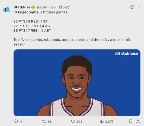 过去3场比赛,76人探花秀VJ-埃奇库姆场均出战39分钟,得到31.7分8.7篮板6.3助攻1.3抢断1.3失误,投篮命中率52%,三分命中率42.3%,罚球命中率85.7%。这3场比赛,分别砍下38分7板11助、35分6板4助、22分13板4助。