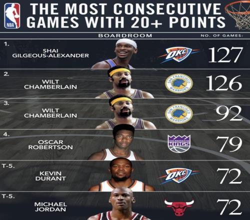 北京时间2026年3月13日,亚历山大在雷霆104比102险胜凯尔特人的比赛里拿到35分、9次助攻、6个篮板,连续20+得分场次来到127场,正式超越张伯伦,升到这项榜单第一。上半场他就已经拿到17分,比赛也一直咬得很紧。往下看这份榜单,张伯伦、罗伯特森、杜兰特、乔丹全在里面,27岁的亚历山大这次站到最上面,分量一下就出来了。
