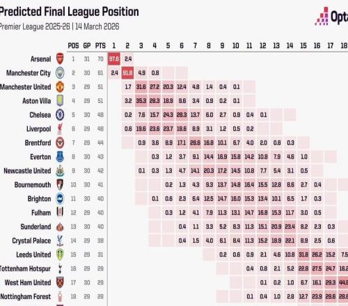 超级计算机预测英超夺冠概率:阿森纳97.6%,曼城仅2.43%